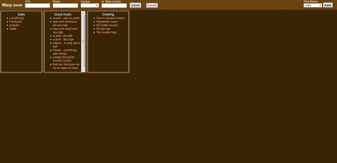 View screenshot View sourceA startpage for people who like to cram as many links on one page as possible. Features the same functionality as bookmarks, but is designed for faster access to individual links by not hiding them in menus and folders. Set your warp zone as target for a new tab in the browser and you can click your target directly.